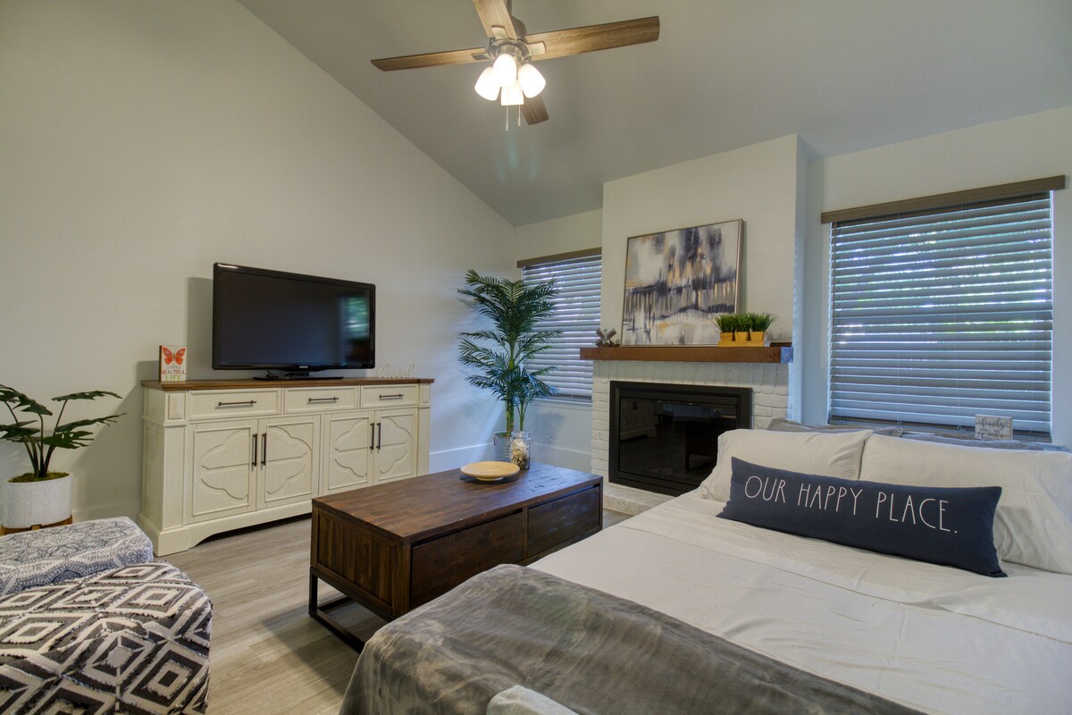 Esta histórica casa de New Braunfels rezuma encanto a cada paso. Cada día el sol sale sobre las tablas de madera del porche delantero, donde un acogedor banco te espera a ti y a tu café por la mañana. En el interior encontrarás una casa bañada por el sol y llena de arte, cerámica, libros y tesoros del pasado. Es un espacio cálido y acogedor. Un refugio tranquilo de lo cotidiano. Situado en el corazón de New Braunfels, a poca distancia a pie de Comal Tubes, donde puedes alquilar neumáticos y coger un servicio de transporte al río Comal.