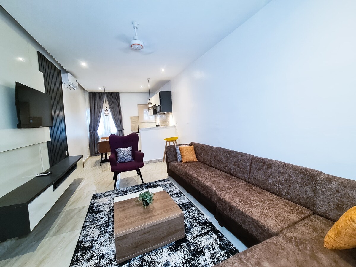 Relajate en este tranquilo departamento de diseño con un dormitorio en Jahi, Abuja. Con tonos cálidos y terrosos, un salón acogedor, un balcón privado y una cocina totalmente equipada, es perfecto para parejas, personas que viajan solas y trabajadores remotos. Disfrutá de wifi rápido, interiores elegantes y un ambiente tranquilo a solo unos minutos del bullicio de la ciudad. Tu hogar moderno lejos de casa.