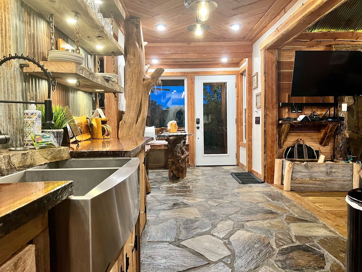 MÍNIMO 3 NOCHES EL 4 DE julio. leña DE cortesía Y uso DE fogata. Entrega de comida y comestibles. Darling Studio Addition Private Covered Patio, Full Kitchen, queen size wall bed. Increíble ducha con suelo de guijarros con tocador de mármol en el baño. Esta unidad es mi más pequeña, es como quedarse en una casa pequeña. Tiene el patio cubierto más grande. No hay vista al lago , sin embargo, tienes acceso al frente del lago caminando por el lado derecho de la propiedad. Fogata de pesca.