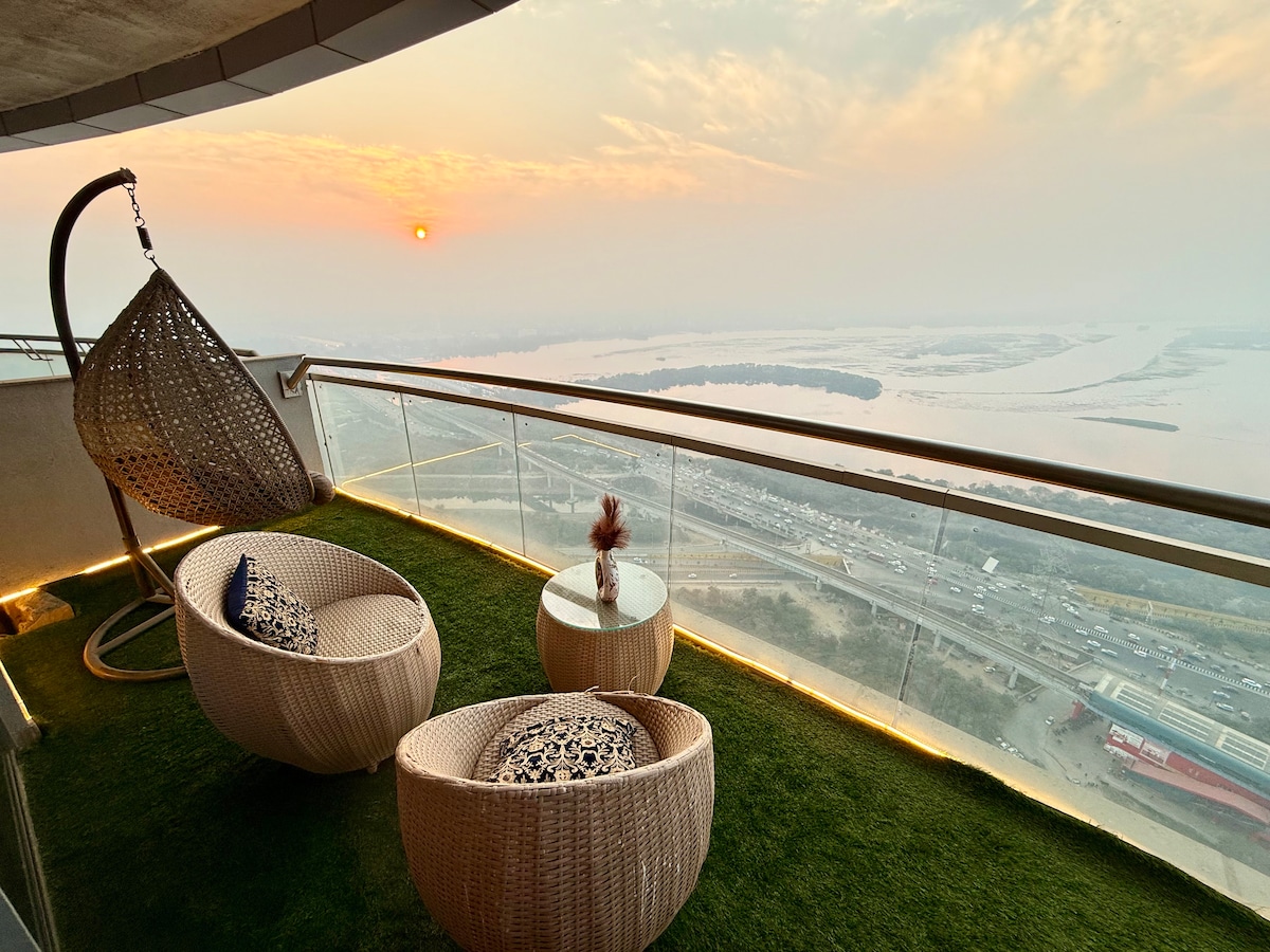 Introducing our exquisite luxury studio apartment: Nestled in the heart of the city, this opulent studio boasts modern elegance and unparalleled comfort. The open-concept design invites you into a spacious haven, bathed in natural light from the large windows that offer breathtaking city views. This apartment is on the 41st floor in one of the tallest sky scraper in Delhi - NCR. The apartment has a river facing view from the balcony!!