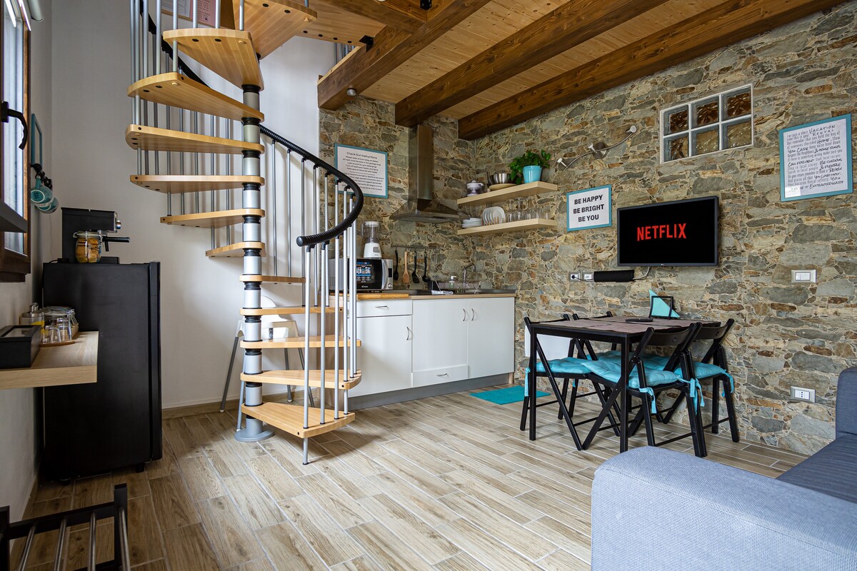 Il bilocale può ospitare comodamente due persone in un ambiente curato e funzionale. All’ingresso si trova la cucina, moderna ed accessoriata (induzione, macchina del caffè, microonde, frigorifero e lavastoviglie). Il soggiorno è lo spazio ideale per rilassarsi: un comodo divano, una smart TV da 50" (accesso a Netflix) e un tavolo perfetto per pranzare o lavorare al PC. Il corridoio porta alla spaziosa camera da letto (con smart TV 40") ed al bagno (dotato di phon e lavasciuga). Centralissimo!