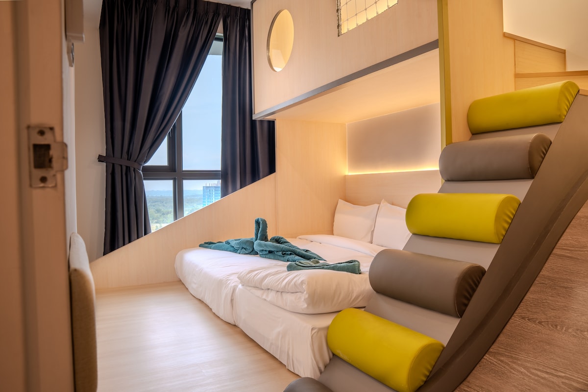 ¡Te damos la bienvenida a nuestra increíble suite Forest Slide Kids en Macrolink Medini! Nuestra casa, ideal para niños, ofrece un divertido parque de juegos con toboganes y camas de dos pisos. ¡A tus hijos les va a encantar! ¡Tenemos un proyector HD para ver películas y una consola de juegos Arcade para jugar gratis! Cómodo para alojar hasta 7 personas, ¡ideal para vacaciones en familia con niños! ¡Hay una piscina especial con temática de Miami Beach para que los niños disfruten! ➤ A 5 minutos de Legoland y Medini Mall. A ➤ 5 minutos del puerto de Puteri ➤ A 5 minutos de Eco Botanic