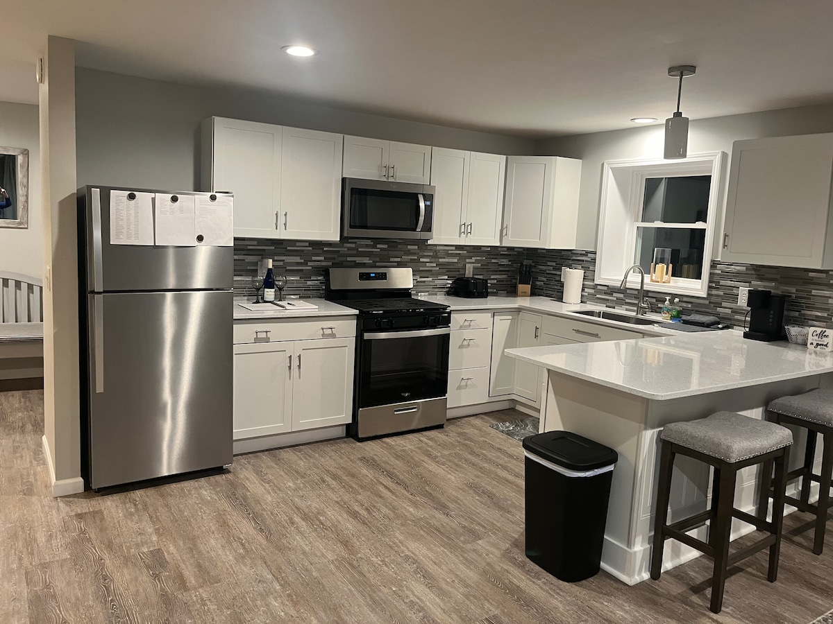 Amplia suite privada con entrada independiente y baño completamente nuevo. Tendrás todo el nivel inferior con un baño completo que incluye lavandería. Hermoso dormitorio tamaño queen. Cómodo sofá con diván listo para que pongas los pies en alto y te relajes. Tiene una cama tamaño queen extraíble para dormir más. Mesa de juegos con suministros. Barra de café con todos los elementos esenciales, incluida una mininevera y microondas. Incluso puedes hacer ejercicio usando la cinta de correr.