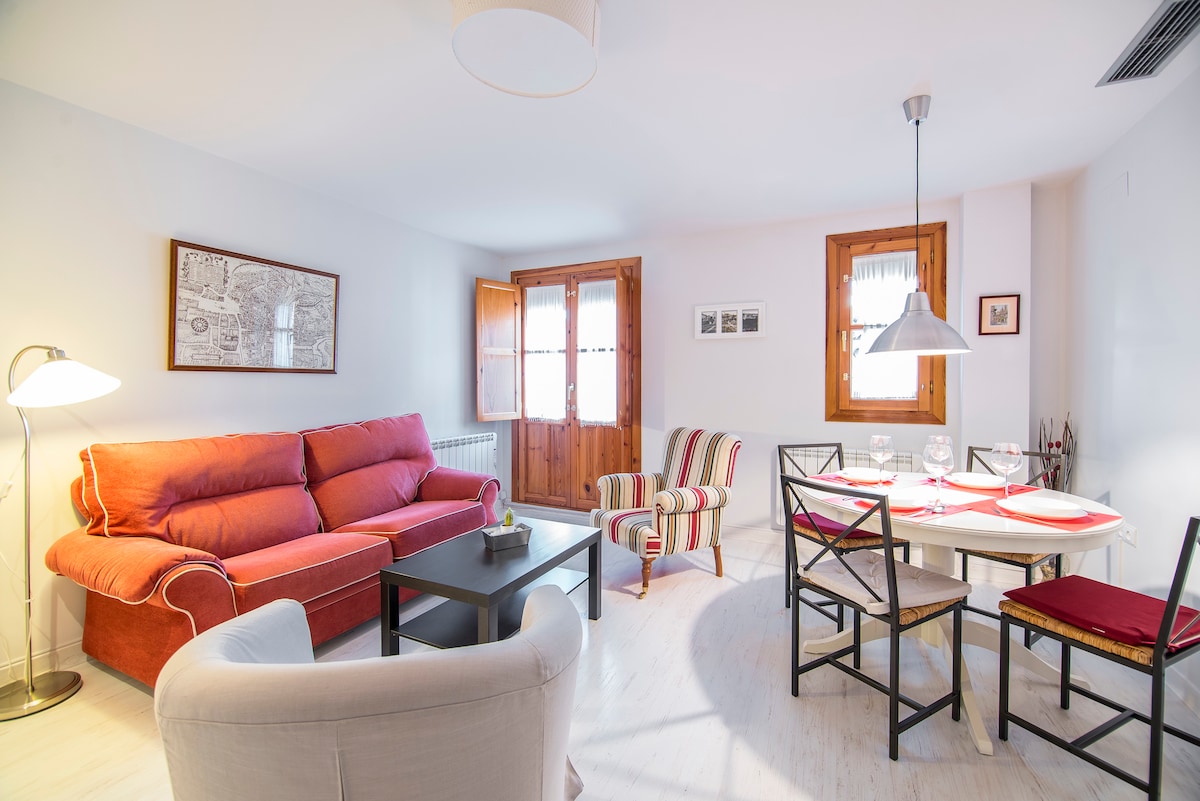 Cosy, airy and comfortable two-bedroom condo with four balconies overlooking a pedestrian street located just a 10 minute walk from La Alhambra and off the Alhambra Forest (El bosque de la Alhambra) The fully equipped kitchen allows you to prepare your meals in case you don’t feel like eating out. You can also do your laundry in the washer-dryer combo. There’s a living/dining room combination with comfortable sofas, round table and TV … sounds ideal to relax after a long day sightseeing.