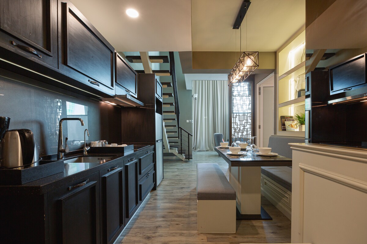 Condominio dúplex completo: Penang Máximo 6 huéspedes 2 dormitorios, 2 baños. 1 dormitorio principal con baño privado. 2 camas individuales 1 sofá cama 1 baño en la planta baja del dúplex. Preciosas suites dúplex ubicadas en el corazón de la zona marítima.