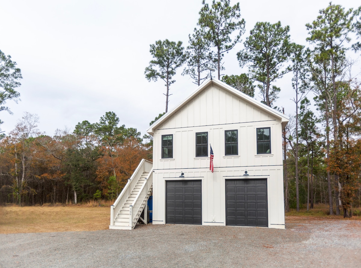 Ubicada en un entorno privado de Lowcountry, esta Carriage House cuenta con una gran sala de estar con un dormitorio, cama tamaño king, un baño, cocina completa y lavandería. Los huéspedes tienen todo el segundo piso de la vivienda al que se accede mediante un tramo de escaleras con entrada privada. Convenientemente ubicado a un par de millas encontrarás acceso público a la playa con estacionamiento, desembarques de barcos, golf y restaurantes. El propietario vive en una casa separada en la propiedad.