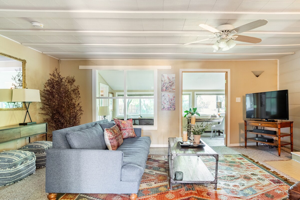 The Wine Ranch Just five minutes north of Healdsburg Plaza, The Wine Ranch is a beautifully remodeled ranch-style home, set on over a half acre of lush outdoor space. The property features a bocce ball court, ping-pong, an expansive deck and patio perfect for al fresco dining or tranquil relaxation. Designed to host gatherings, the spacious living room, dining area, and gourmet kitchen create an inviting atmosphere for couples, families, or groups of up to eight friends.