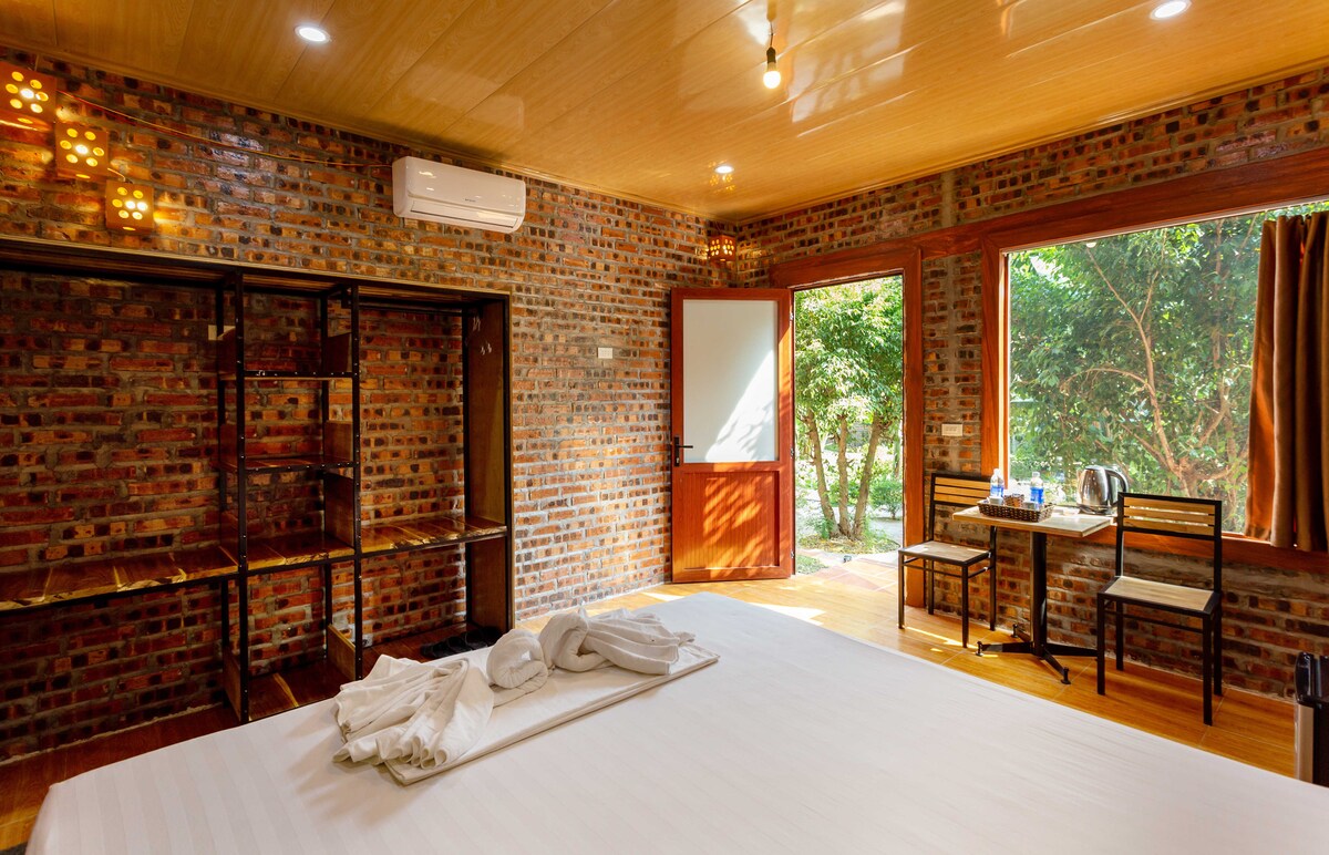 Phòng boutique dành cho 2 khách, nằm trong không gian xanh mát, yên tĩnh, thích hợp cho nghỉ dưỡng và thư giãn. Từ khu vực lưu trú, khách có thể tận hưởng khung cảnh thiên nhiên trong lành, nhiều cây xanh và không khí dễ chịu. Phòng được thiết kế gọn gàng, ấm cúng, đầy đủ tiện nghi cơ bản, phù hợp cho các cặp đôi hoặc du khách tìm kiếm sự riêng tư và bình yên trong kỳ nghỉ.