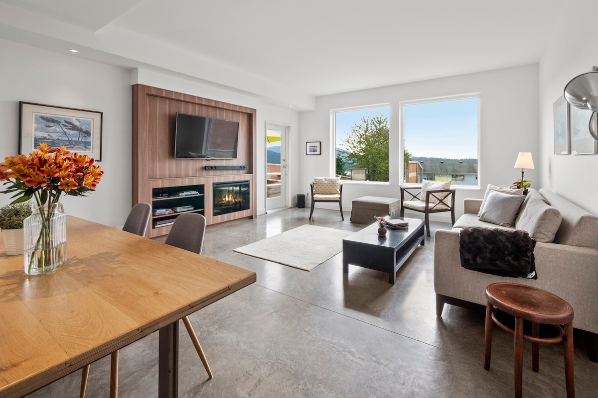 Moderno NUEVO con licencia completa H346845045 BC # RGA#202302. 2 camas, 2 baños, privado con secadora, espacio de trabajo, internet de alta velocidad. Camina hasta el paseo marítimo, el puerto deportivo, las playas, los pubs cerveceros, las galerías, las tiendas y las cafeterías. Amplia suite soleada con techos de 9'. Vistas a las montañas de North Shore, la isla Keats y más allá. Amplia terraza privada para disfrutar de las puestas de sol del verano. - Calificación de 4,96. Cocina de chef, TV, chimenea, jardín, ¡se admiten perros! Juegos, juguetes, libros para niños y adultos.
