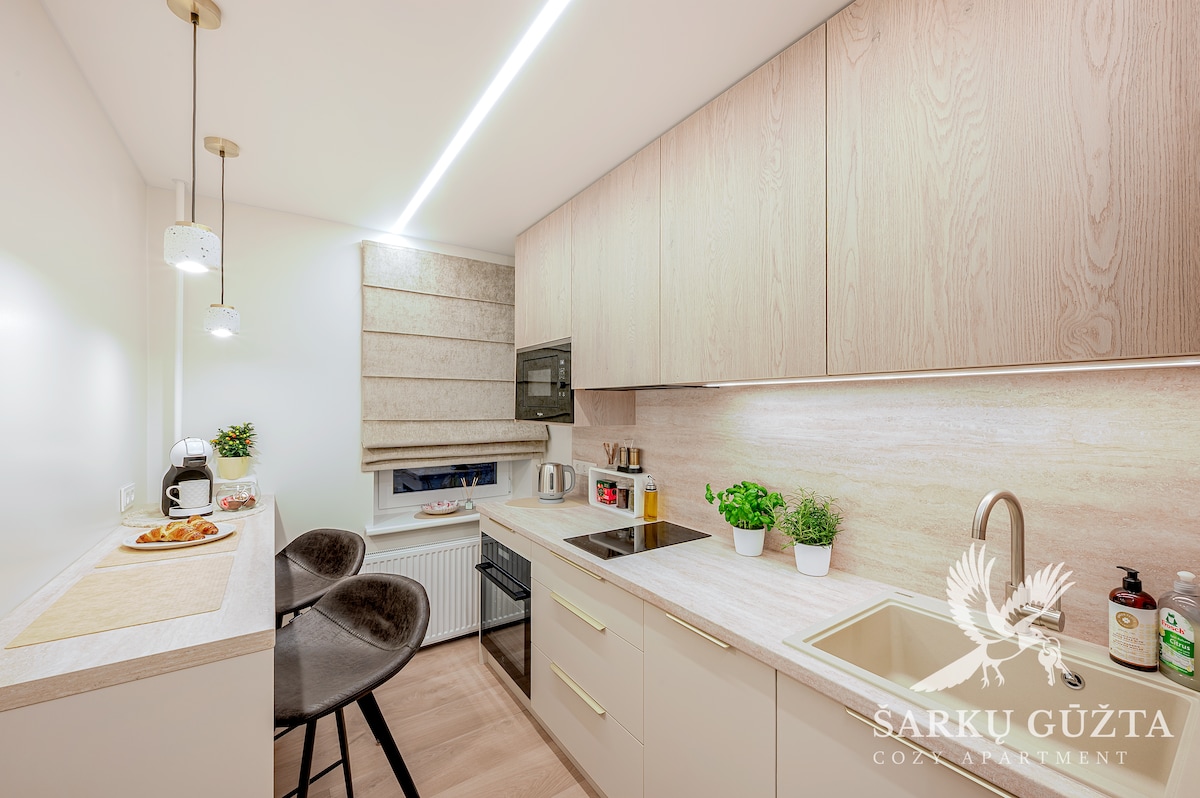 Stay at the newly renovated SarkuGuzta Cozy Apartment – a modern 36 m² space with a double bed, a sofa bed, a large TV and air conditioning. The apartment is fully equipped for a comfortable stay. The apartment has a private entrance and contactless check-in/check-out. Parking is free everywhere around the building. Right next to the apartment (2 minutes on foot) you will find Maxima XX and Lidl supermarkets.