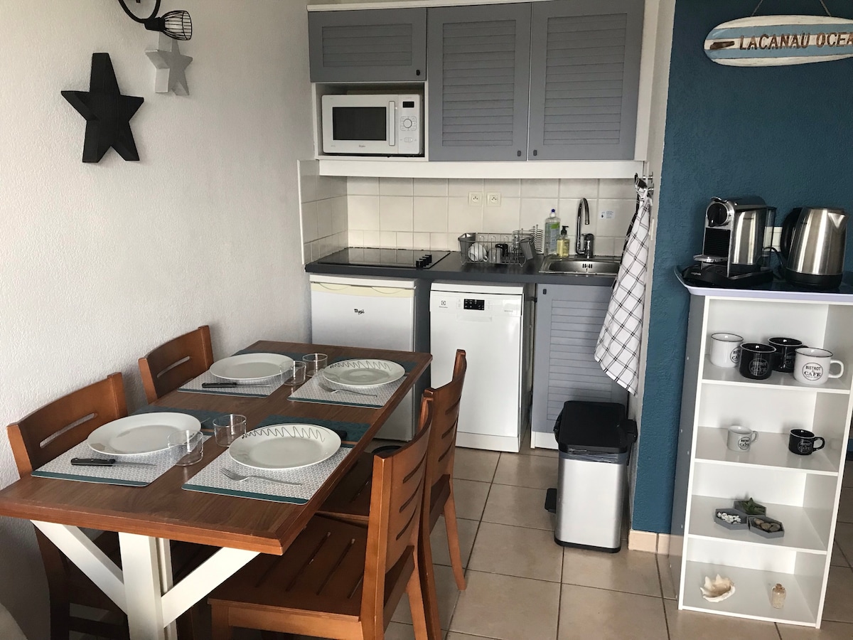 Venga a disfrutar del lago de Carcans Maubuisson en nuestro pequeño estudio de 15 M2, con terraza y acceso directo al lago. Estudio situado en el 1er piso con escalera, no accesible para personas con movilidad reducida. Tendrá un espacio de estacionamiento gratuito (barrera automática con caja electrónica), una caja de llaves le permitirá acceder al estudio. En el interior, cuarto de baño con inodoro separado, cocina equipada, zona de estar con sofá/cama de 160 cm, almacenamiento y proyector de video.