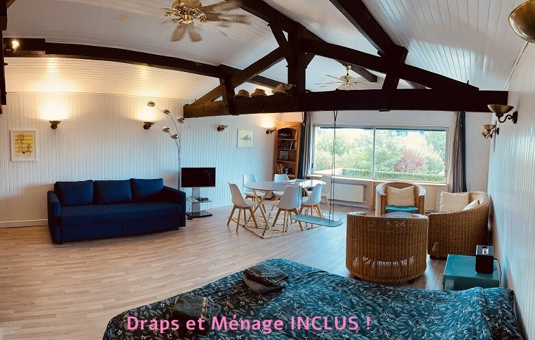 appartement loft de 100 M2, totalement privatisé. atypique et spacieux. le loft est parfait pour recevoir un couple. cuisine équipée et système hi-fi de dernière génération, avec fibre internet l'espace idéal pour se reposer ou à transformer en un lieu de télé travail. les serviettes et draps sont fournis. Le logement est en duplex sans porte avec la chambre et salle de bain à l’étage accessible par un escalier sans rambarde. profitez d'un grand espace à seulement 15 min de bordeaux