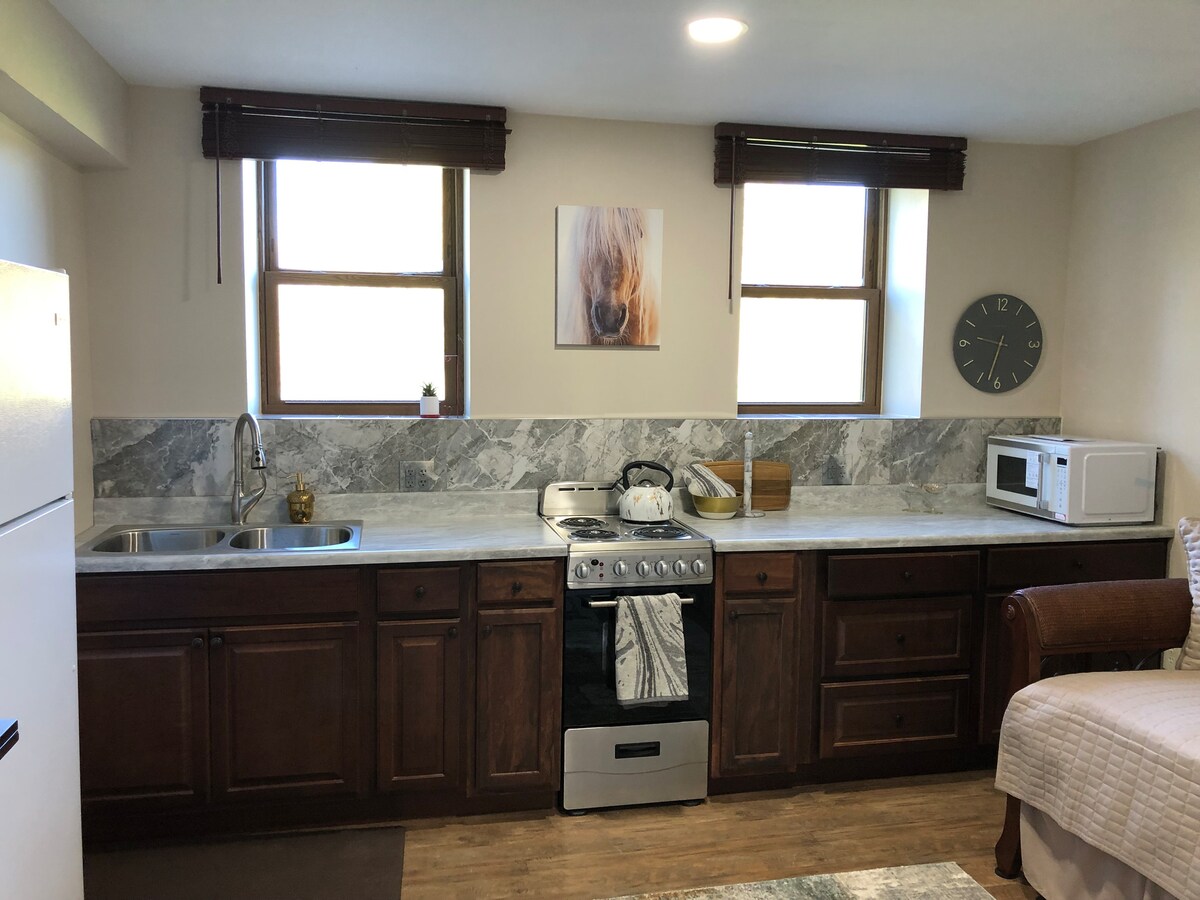 "Rest A While". Enjoy our private guest suite that features a large main living area where the kitchenette and dining area are also located, a separate bedroom and private bath. This suite is located on the lower level of our raised ranch and requires the ability to use six steps. Check yourself in at the private front entrance with keypad. Driveway parking spot with paved lighted walkway to the entrance.
