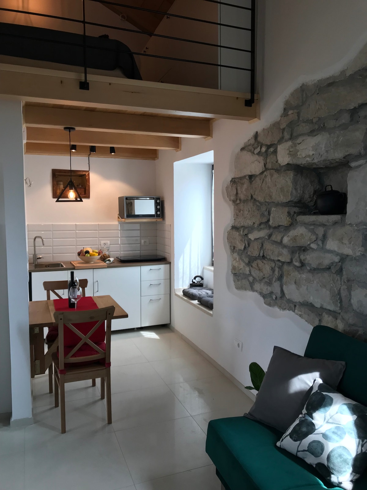 Bienvenido al apartamento estudio Pisino. Nos encontramos en el centro histórico de la ciudad de Pazin, junto al castillo medieval de Pazin, y desde la ventana se puede ver el descenso de la tirolina sobre el abismo de Pazin. Tiene a su disposición un apartamento de 70 m2 de espacio abierto, en la planta baja hay una cocina totalmente equipada, una sala de estar con TV y un baño con ducha. En la planta superior hay un dormitorio como una galería abierta con un televisor grande, y junto a él un baño con ducha. El espacio está climatizado y dispone de WiFi gratuito.