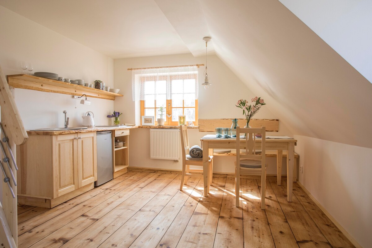 The large Umgebindehaus of cloth merchant C. W. Henke sits in the heart of Upper Lusatia. Built in 1831 and carefully restored, it blends historic character with modern comfort: original doors, windows and floorboards, Meissen tiled stoves, linseed‑oil paints and 1930s wallpapers. With 260 m², it offers space for up to 11 guests, a big dining table, plenty of toys and a fully equipped kitchen. Depending on the season, the wild garden, the terrace or the vaulted sauna invite you to relax.