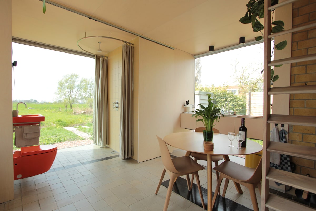 Esta antigua casa transformadora ha estado alrededor del hermoso pueblo frisón de Wirdum durante más de 100 años. Se ha convertido en una hermosa cabaña de senderismo con gran cuidado y atención. También puedes llamarla una pequeña casa, porque a pesar del pequeño espacio, está equipada con casi todas las comodidades. En el pueblo encontrarás una cafetería/restaurante y un pequeño supermercado con pan de la panadería caliente.