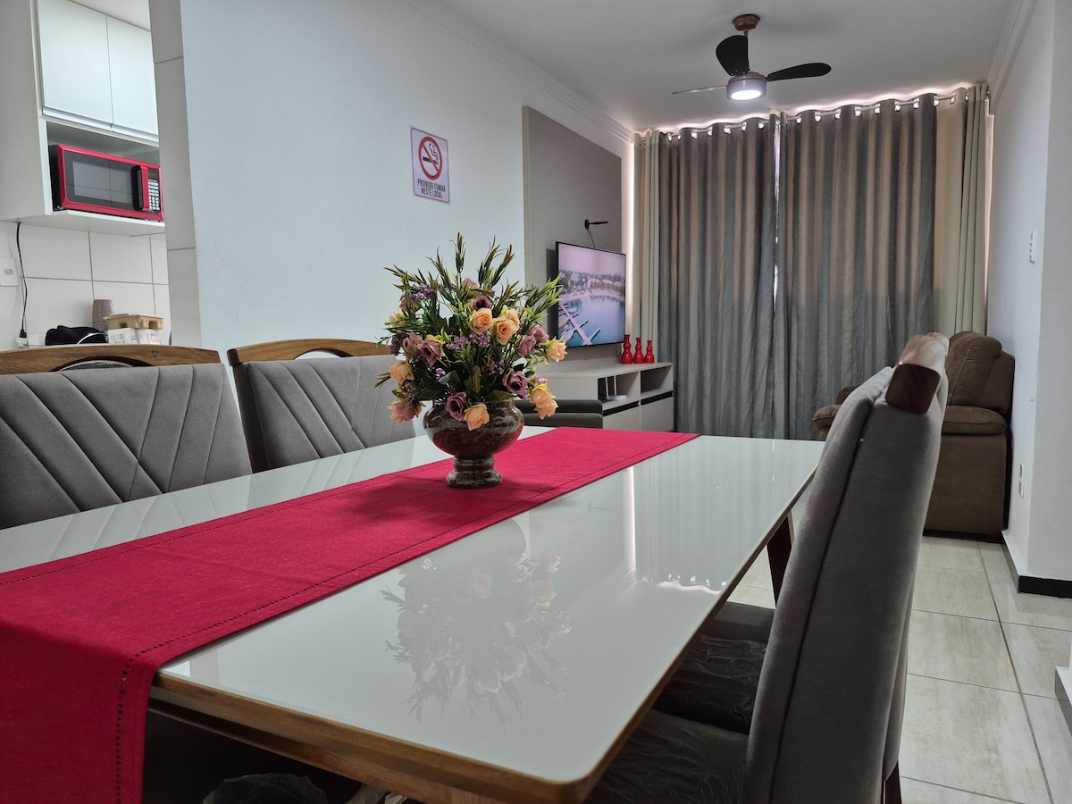 Flat confortável, seguro e bem localizado. Contamos com garagem para carro e motos, sistema de vigilância por monitoramento por câmaras 24h/dia. Varanda panorâmica. Perto de supermercados, farmácias e padarias. Suíte com ar condicionado, armários, mesa de escritório, chuveiro quente, geladeira, Wi-Fi, tv 32”, guarda roupas. Microondas, sanduicheira,Armários de cozinha com panelas, talheres, copos e pratos.