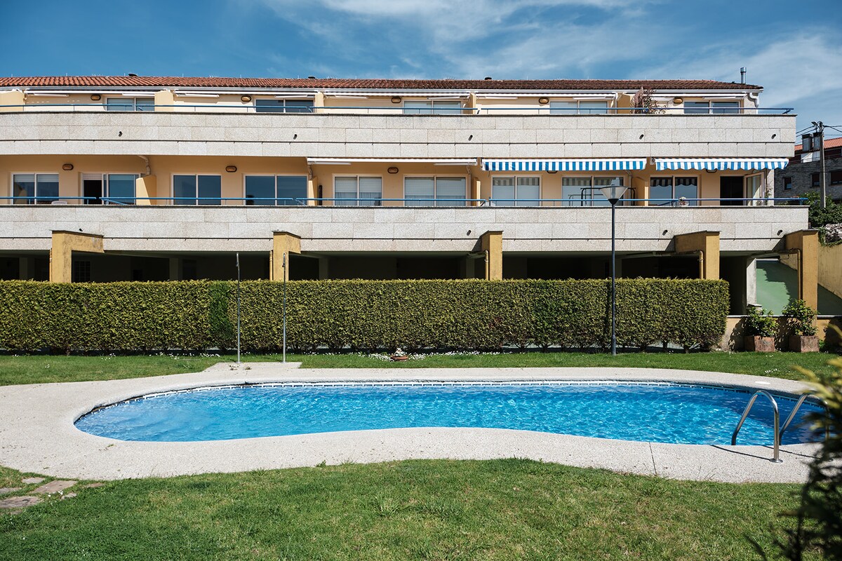 Apartamento para 6 personas con acceso directo a Playa Aguieira en Porto do Son, una de las mejores playas de la zona, ubicado en un recinto cerrado con amplia piscina, jardin de 1.000 m2 y zona de aparcamiento gratuita. El alojamiento está totalmente equipado y dispone de una amplia terraza, 3 dormitorios, salón-comedor-cocina y 2 baños. Incluye Wifi gratuito. Climatizado (aire acondicionado y calefacción). Mobiliario de interior y exterior. Vistas a la piscina y a playa Aguieira.