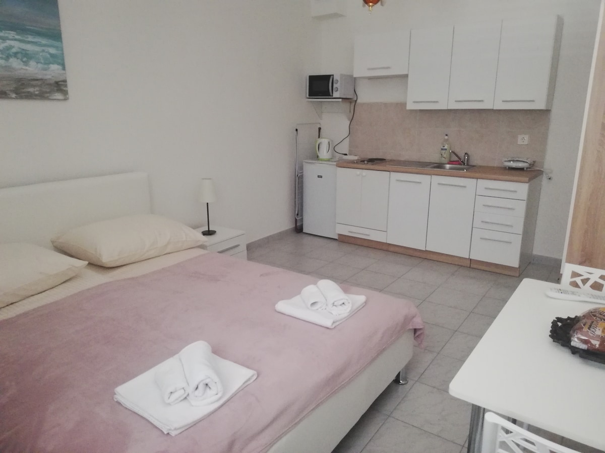 Apartamento estudio Ana de unos 20 m2, en el centro de la ciudad de Vis, a solo 60-100 m de la salida del ferry. La vista desde el apartamento es justo sobre el parque de palmeras y la calle principal de la ciudad, y la vista desde la otra ventana es sobre el estacionamiento. El apartamento estudio Ana es completamente nuevo, y espera con ansias a sus huéspedes (2). Inmediatamente después de salir del apartamento, hay todas las comodidades necesarias para planificar una visita a las hermosas playas de Vis, y si decide ir a la playa de la ciudad, puede caminar (hasta 500 m) hasta la playa de la ciudad.