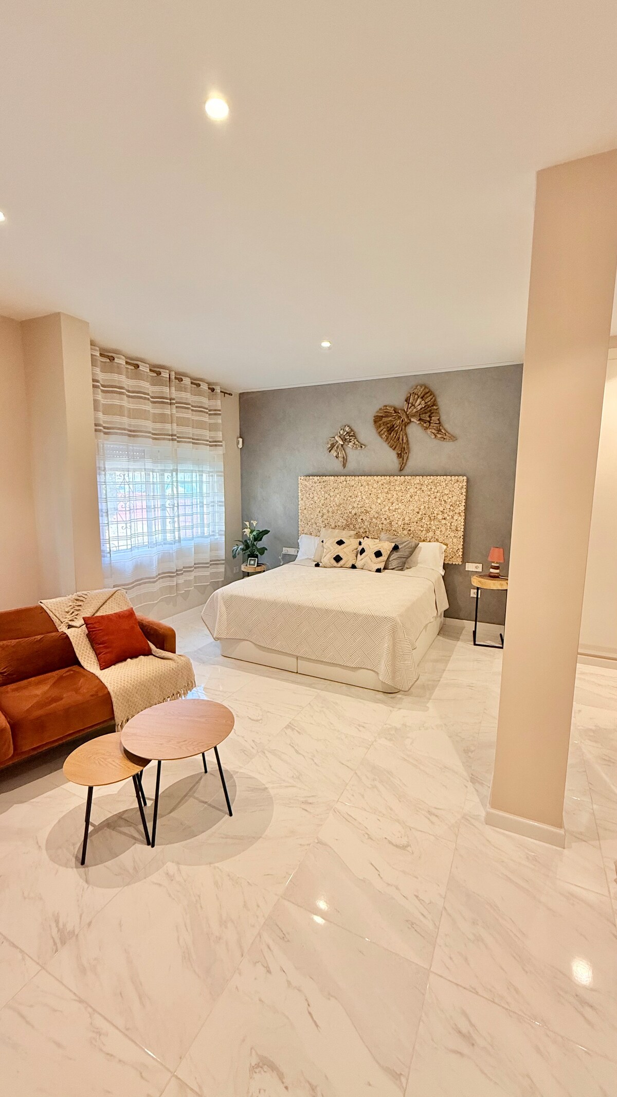 This beautiful, spacious and luminous 110 sqm loft is located in the heart of Alicante’s historic center with views over the old town. We renovated and designed this place respecting the traditional ways to build at the time, with limestone and wooden beams, while offering all the amenities of a modern apartment and a little bit of luxury. The beach is a 5 minutes (350m) walk away and the numerous nearby bars and restaurants invite you to enjoy the typical Mediterranean vibes of the old town.