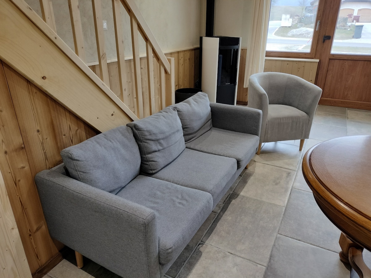 En una granja de 1700, la casa rural atemporal le ofrece un entorno idílico. Capacidad para 6 personas (2 habitaciones dobles y un sofá cama), la casa está totalmente equipada(cocina, baño). Su terraza de 40 m2 con su spa de 6 plazas le ofrece una vista sin vecinos. Comercios a menos de 10 minutos. Ideal para relajarse, las pistas de trineos al pie de la terraza harán las delicias de niños y mayores.