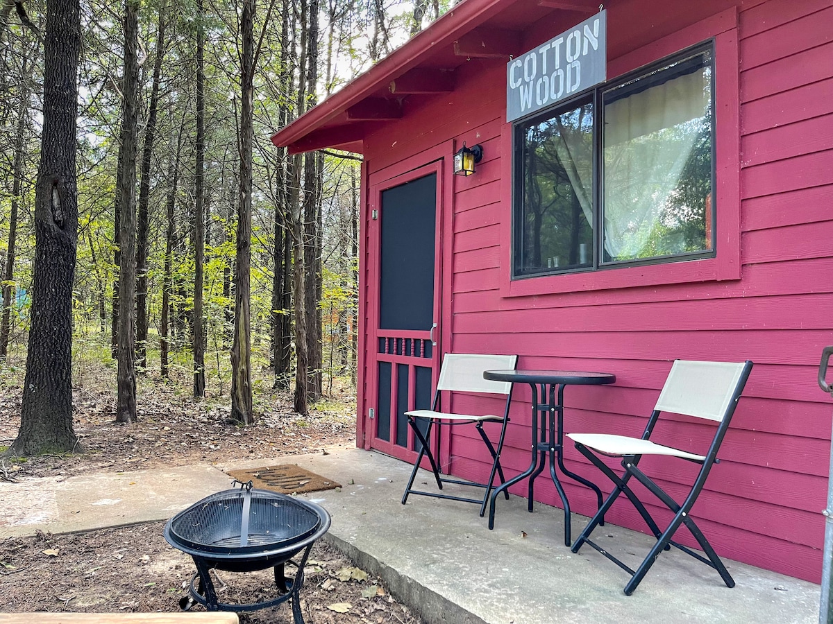 Escape city life in this little piece of heaven. Enjoy nature in this oasis getaway. We have 25 acres of forest, two ponds & amazing hiking trails. Sleeps 3. With a kitchenette and rain head shower. All bedding is provided. A tv with 200 channels, fridge, microwave and coffee maker for your convenience. Gather round the fire pit and grill. Then sip some coffee on the back deck in am. Texoma offers great fishing, boating and swimming. Feeling lucky? Visit the casinos! Can't wait to see y'all!