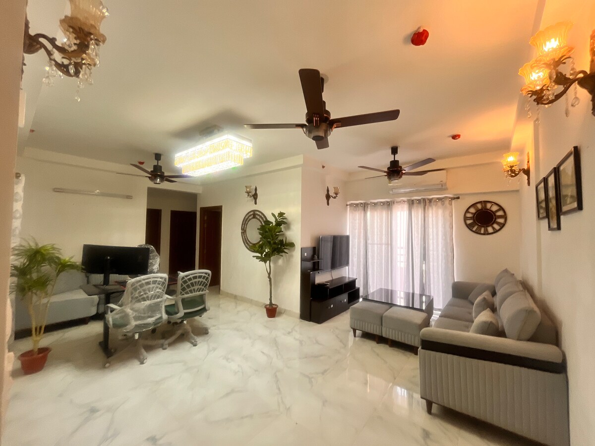 Nuestro apartamento de 2 dormitorios de nueva construcción combina la comodidad moderna con el encanto natural. El espacio cuenta con 2 dormitorios serenos con camas tamaño queen, una amplia sala de estar, una cocina bien equipada, 2 baños: uno adjunto al dormitorio principal y otro accesible desde la sala de estar y el segundo dormitorio y un balcón en forma de L que ofrece excelentes vistas de la ciudad. ¡La propiedad se encuentra cerca de un centro comercial prémium en Noida! Esta ubicación bien situada te ofrece la comodidad de tiendas, cafeterías y entretenimiento.