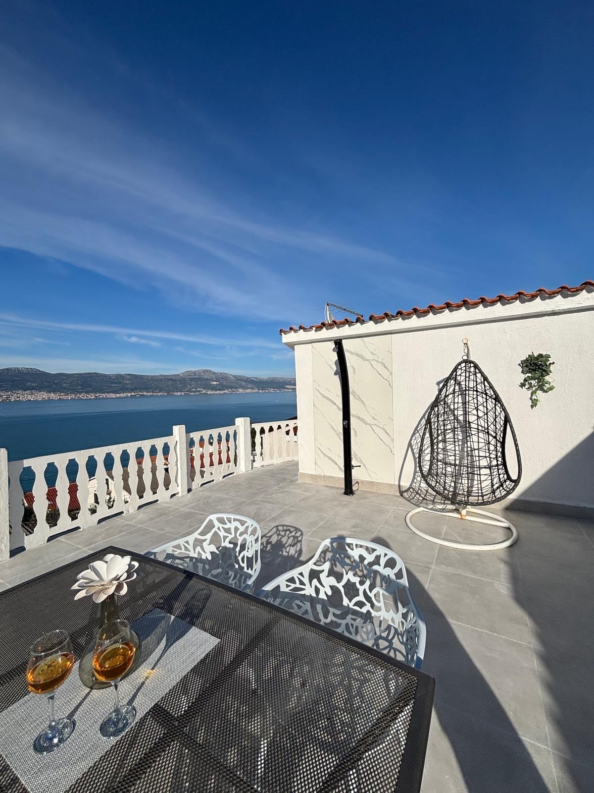 La villa tiene dos plantas, conectadas por escaleras internas. En la planta baja hay una sala de estar con salida y vistas a la piscina, cocina con salida a una barbacoa exterior cubierta, un baño y una habitación con baño privado. En la segunda planta hay 3 habitaciones, una galería con vistas al cielo y el baño. En el exterior hay una piscina, una zona de sol, una ducha, un jacuzzi y un trampolín. La casa tiene 4 plazas de aparcamiento, Split está a 16 km, el aeropuerto a 3 km, Trogir a 13 km, la playa está muy cerca, autobús, farmacia, mercado, panadería a 100 m.