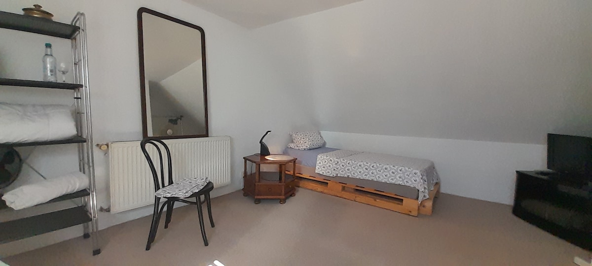 La habitación con cocina integrada y baño con ducha/inodoro separado tiene su propia entrada y es accesible sin barreras. Se encuentra en una casa de dos familias. La cocina está equipada con utensilios básicos de cocina y nevera. Armario, cómoda, una mesa y dos sillas, una cama doble. Hay wifi disponible.