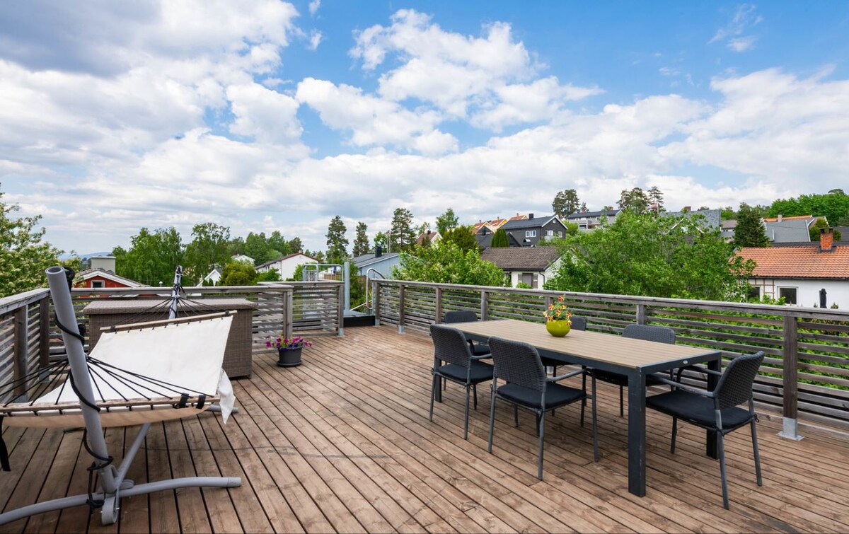 Secluded 1-room attic apartment in villa with rooftop terrace. Easy acces to Oslo city center with bus or train. Peaceful area close to forest, football- and tennis fields. Spacious rooftop terrace (63 sqm) with sun all day in the summer. Apartment is 43 sqm (floor area). Suitable for two people in a queensize bed. In your booking request, please tell us a little bit about yourself and the reason for your stay. Max number of guests: 2 or by request Parking: Not included or by request