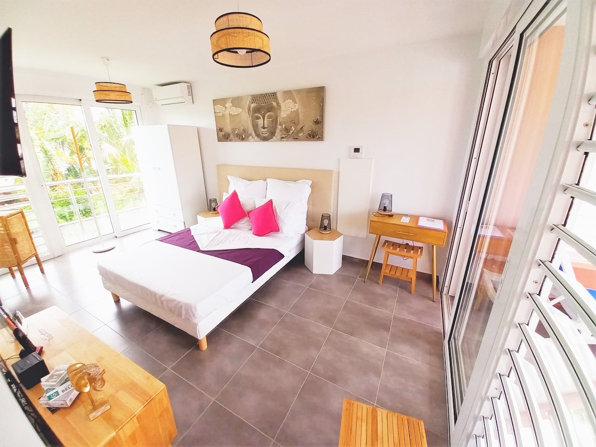 Au DOMAINE SHZEN, Havre de paix classé 3 étoiles Atout France, ce cottage F2 en bois noble et pierre est niché au cœur des champs de canne à sucre du Moule. Son design "Zen" et éco-responsable invite à une déconnexion absolue. Profitez d'une chambre spacieuse avec literie standing, d'un séjour lumineux et d'équipements modernes. Sa terrasse privée est un refuge intime pour savourer la douceur antillaise. En séjournant ici, vous bénéficiez de l'expertise bien-être unique.
