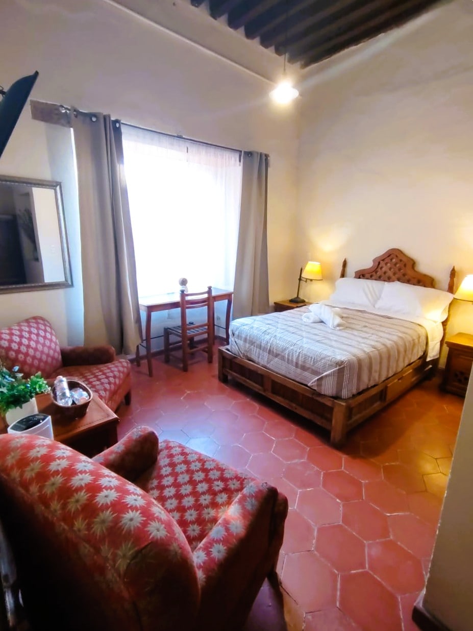 🏡 Hospédate en una casona colonial del Siglo XVIII en el corazón del Centro Histórico de Guanajuato. 🎭 Esta suite fue testigo del nacimiento del Festival Cervantino, donde los artistas se preparaban para los Entremeses Cervantinos. ✨ Combina comodidad moderna, Wi-Fi y baño privado, con la magia histórica y cultural de la ciudad a tus pies, sobre la calle Positos.