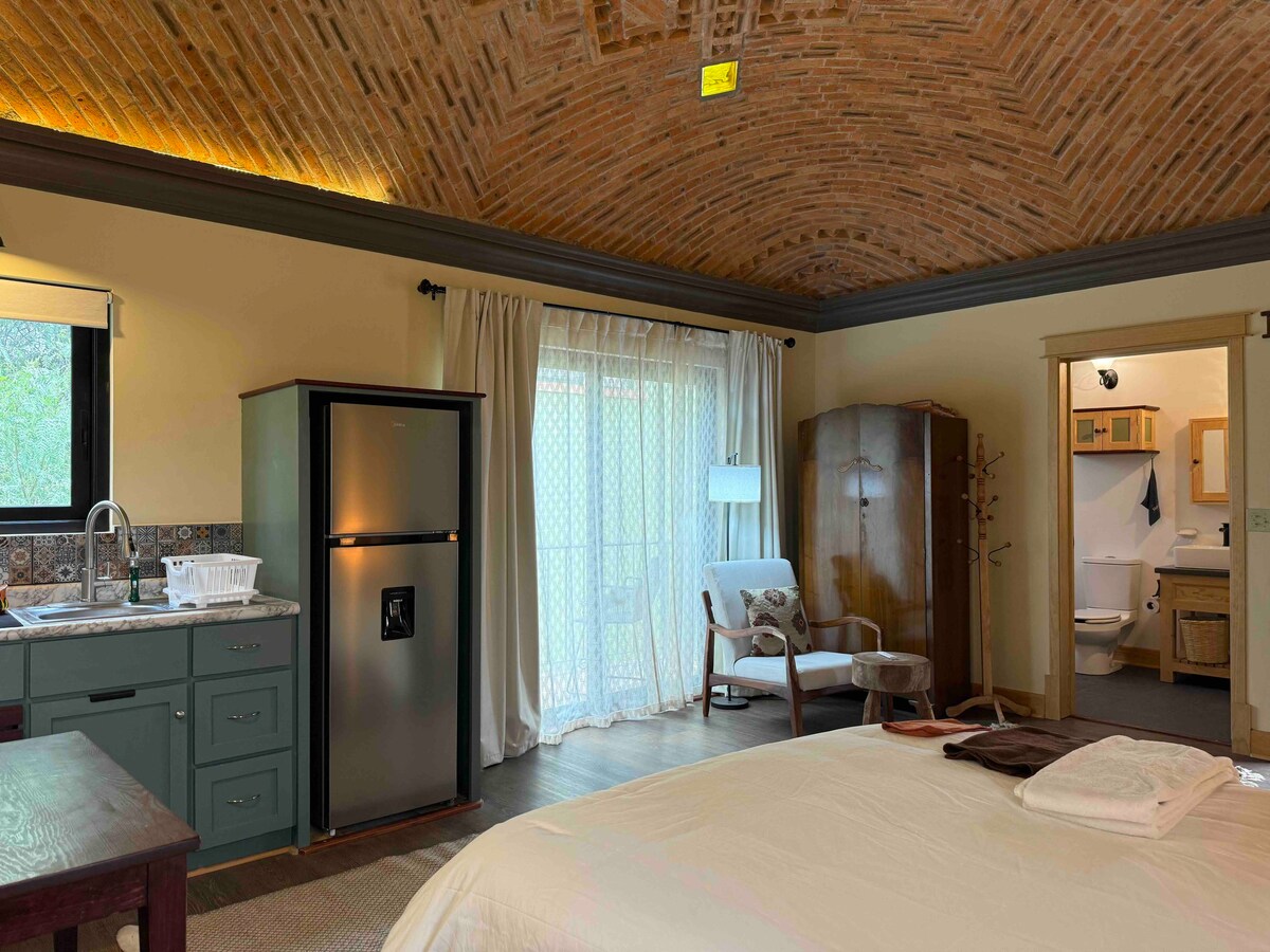 Disfruta este santuario con una divina suite con entrada privada, cama king, tina hundida y acceso a una terraza. Relájate en un camastro, lee en la hamaca, una copa de vino en la mesita de bistró junto al huerto. Increíbles vistas del atardecer con un cielo inmenso. Te esperan muchos detalles para consentirte, y un ambiente zen, a solo 15-20 minutos a pie del Centro. Superhosts de 5 estrellas por años estaremos encantados de darte la bienvenida. Echale un vistazo a nuestra Casita para comparar.