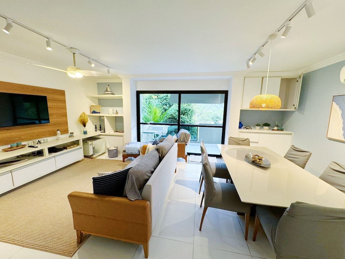 Hermoso apartamento, nuevo, limpio y bien ventilado. El condominio cuenta con servicio de playa y zona de ocio completa. Hay 3 dormitorios y 2 baños, una suite con cama queen y los otros 2 dormitorios con camas individuales idénticas, que se pueden unir. Cuenta con 2 plazas de aparcamiento, aire acondicionado en todas las habitaciones y en la sala de estar. La ubicación es perfecta. Se encuentra a 2 cuadras del paseo marítimo de la playa de Enseada, rodeado de restaurantes, farmacias, supermercados, tiendas. Se puede hacer de todo a pie.