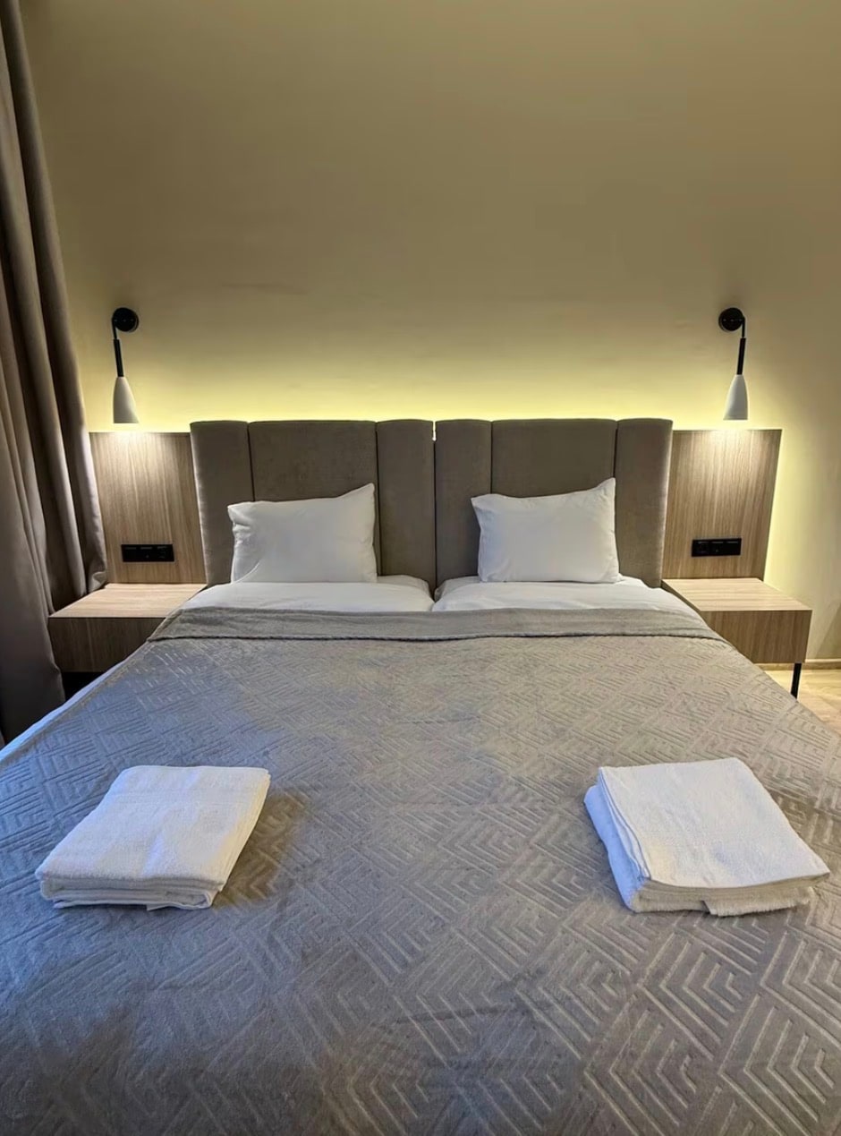 Well decorated and furnished Studio Hotel apartment with spectacular mountain view from both balcony and large king size bed, so you can enjoy the spectacular view from balcony or from the bed, it is located in the 2nd floor of loft 2 building of Redco Complex in Heart of New Gudauri, right next to Gondola Ski lift. The apartment has unique design, stunning mountain view from balcony. The apartment has super great location in the centre for those who like Skiing & other snow and mountain sports.