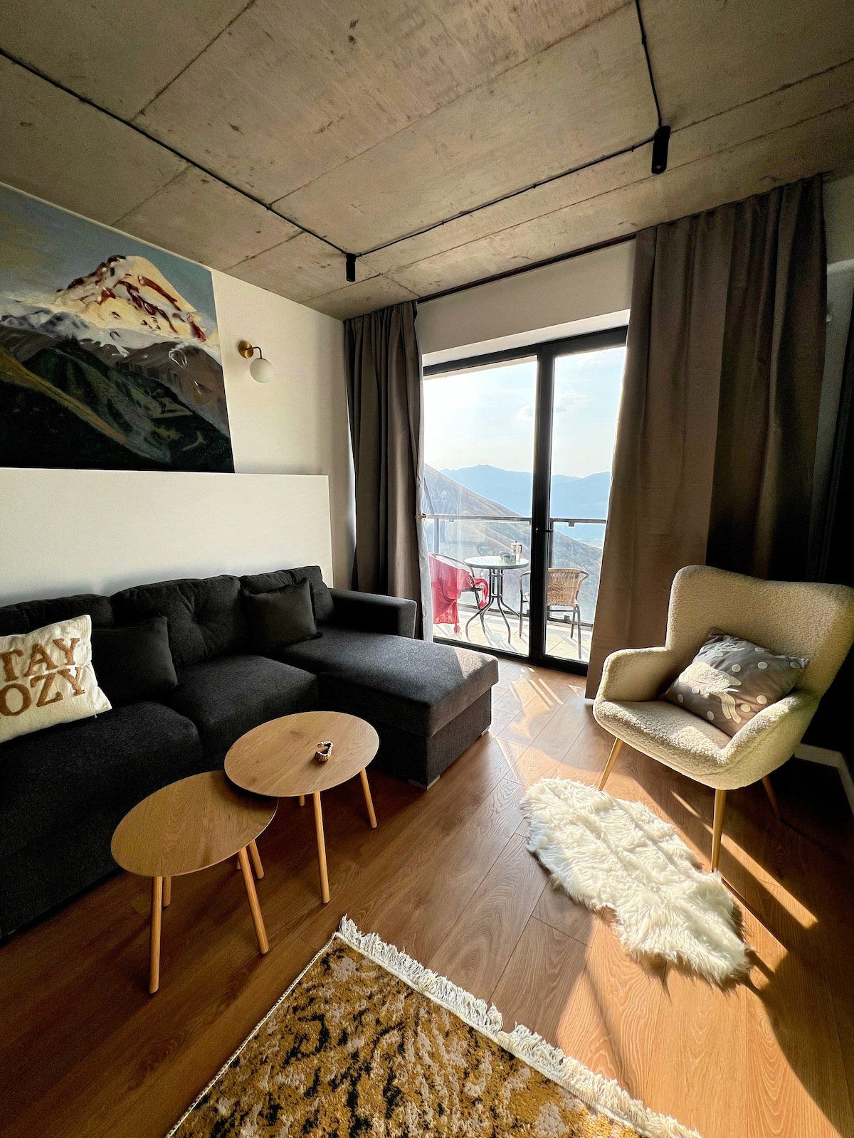 Beautiful chalet atmosphere apartment with panoramic mountain view located in the heart of New Gudauri Ski Resort 2300 m above the sea, in the TWINS Residence. Minimalist design, natural textures and epic view. Enjoy the epic view of the valley of Gudauri and ski run, as well as breathtaking sunsets while taking a hot bath. Mountain streams, the ever-changing sky, herds of livestock with shepherds and unforgettable thunderstorms at night in the summer. Popular Kazbegi is 40 minutes drive away.