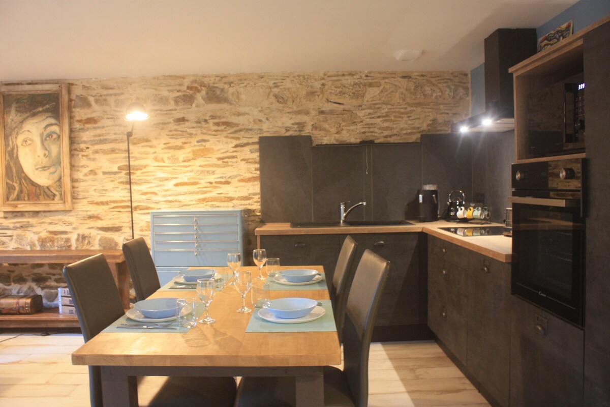 Situada en el corazón de Bretaña, te alojarás en un lugar tranquilo con una hermosa vista del valle y a 8 minutos a pie de la Petite cité de caractère Guémené sur Scorff. Esta casa recientemente remodelada forma parte de una «longère». Es espaciosa y característica, diseñada por un arquitecto de interiores. Un espacio acogedor con una estufa de leña, una cocina totalmente equipada y un gran baño, un dormitorio espacioso con una cama de muelles de 180 x 200.