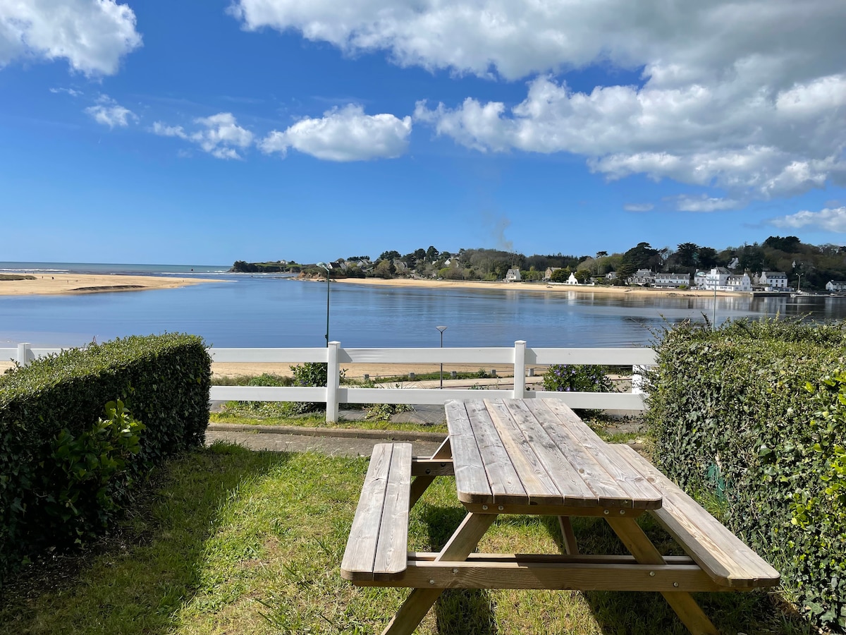 Studio de 26m2 (entièrement rénové en 2023) avec terrasse de 8m2 donnant sur un petit espace de verdure privé. Vue dégagée sur l'embouchure de la Laïta. Bien équipé pour ne penser qu'à profiter (canapé convertible 2 places, lit gigogne, dressing, machine à café, four, lave vaisselle, machine à laver... ) Lieu calme et bien situé, à 2 minutes des plages et autres commodités (à pied: bar, restaurants, superette, boulangerie, boutiques). Draps et serviettes propres fournis (sauf pour 1 nuit).