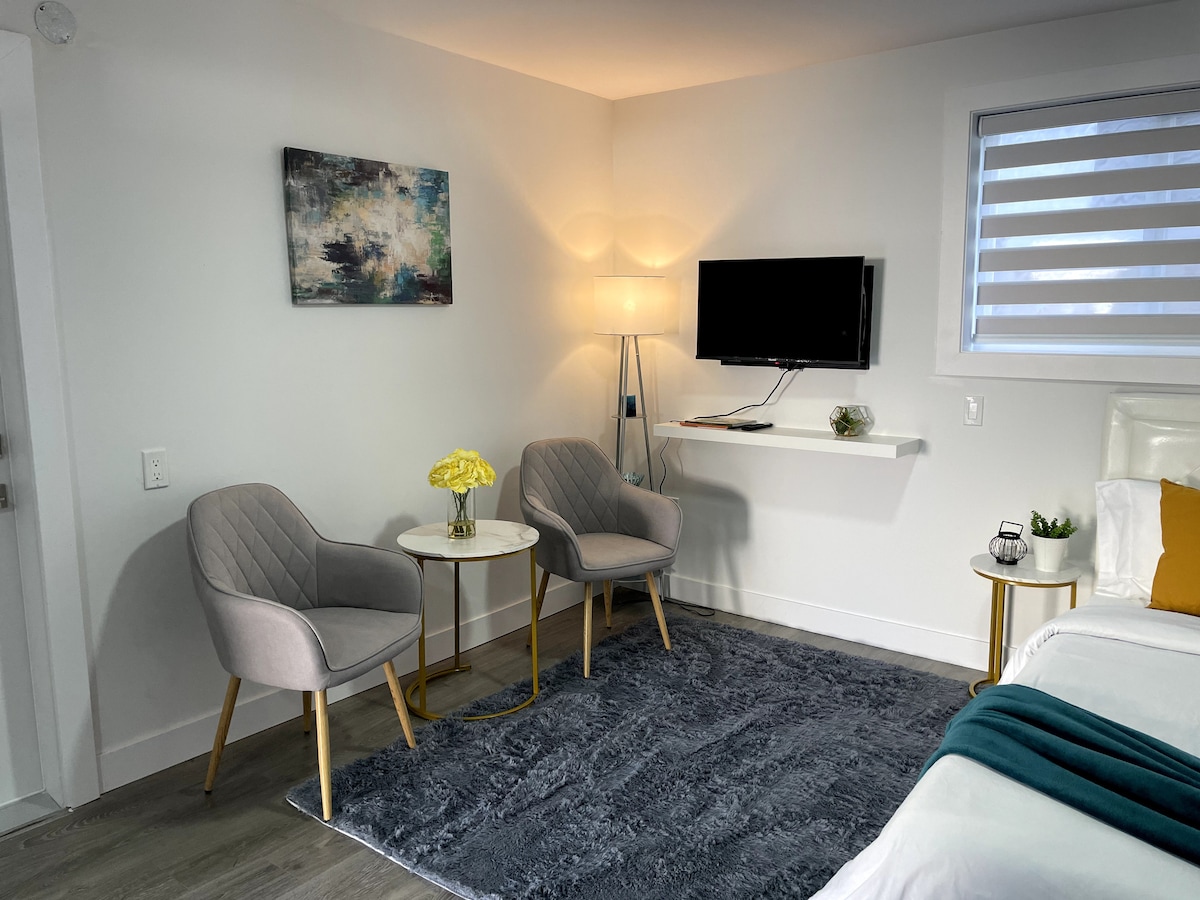 Nueva suite personalizada. 1 dormitorio con 1 cama queen (para 2 personas) + sala de estar (para 2 personas en dos colchones de espuma) + escritorio + baño con ducha. La suite tiene su propio salón con televisión por cable Shaw. Estacionamiento incluido en la entrada de la puerta principal. La suite tiene microondas y heladera en una pequeña cocina americana sin cocina. Escritorio de tamaño completo y silla.