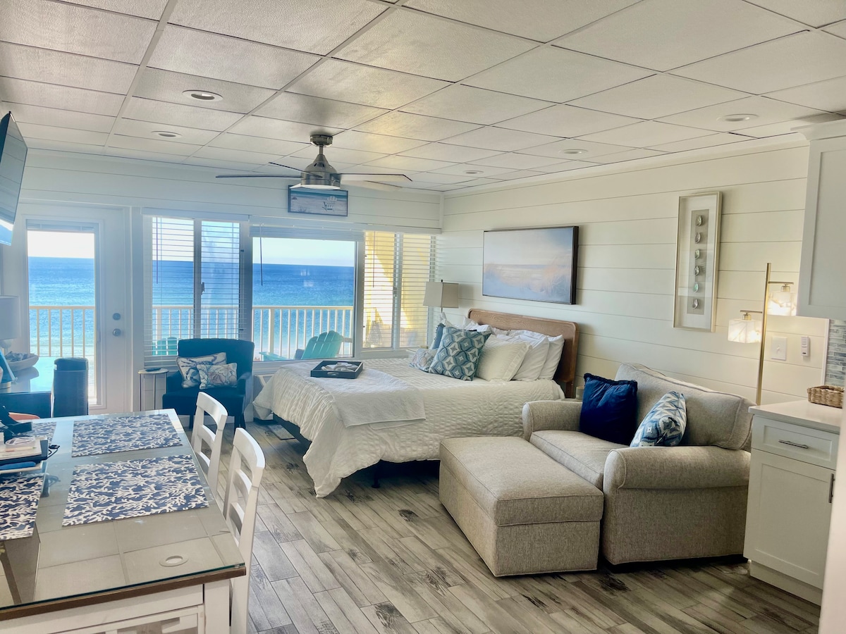 CHECK OUT OUR WINTER RATES! Beautiful BEACHFRONT studio with a private balcony & all the comforts needed for an amazing Beach Getaway. Unit boasts a king-size bed, full size sofa sleeper & full size kitchen. Come enjoy amazing gulf front views & sunsets. This unit is situated directly on the Gulf of Mexico and is less than one 1/2 mile from Pier Park, shopping and many other restaurants. It's located across the street from Gulf World. Great for the entire family or a romantic getaway!