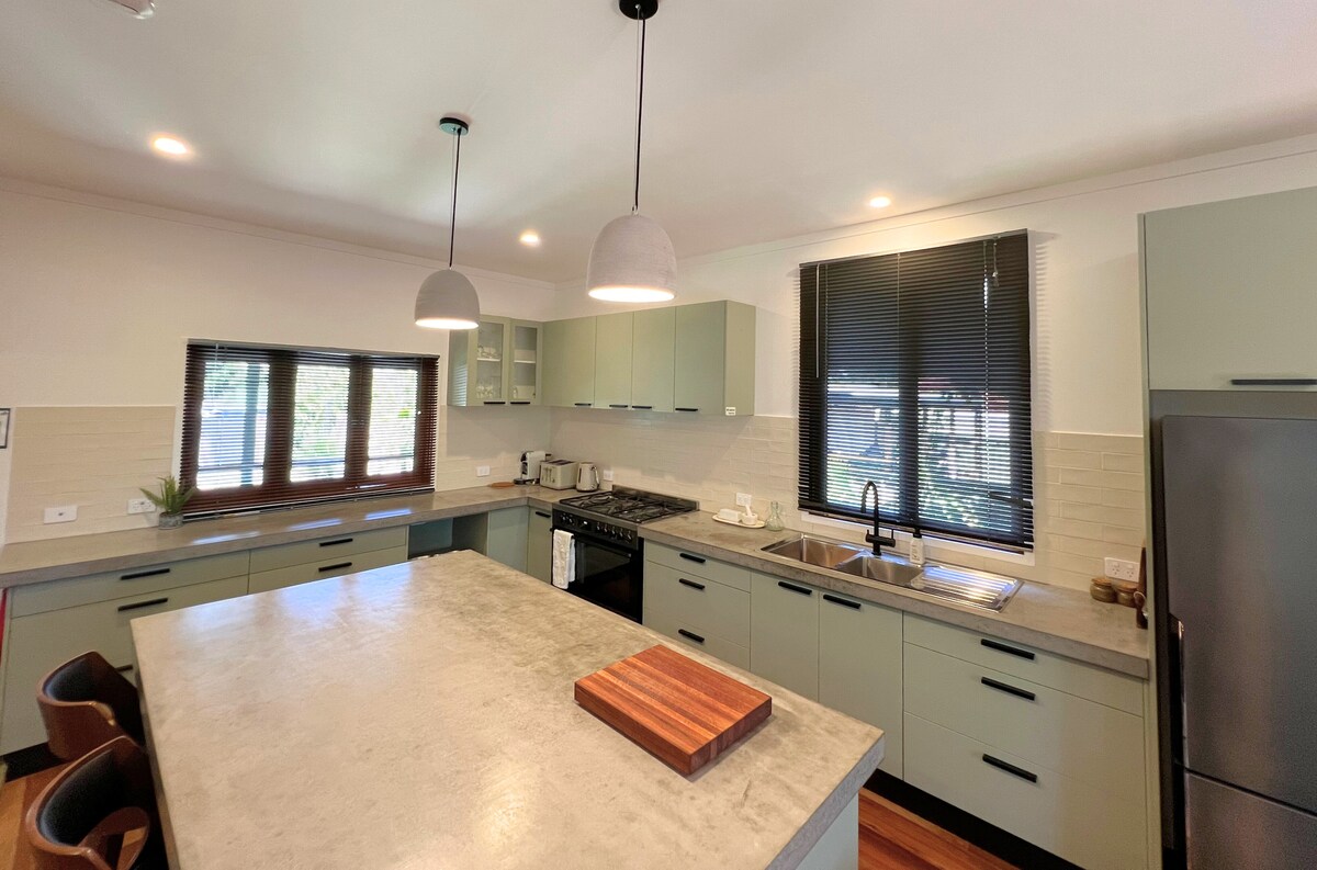 The 1950s cane cutters Barracks looks the same outside but inside it has become a comfortable modern guest wing to the 1920s farmhouse. On the top floor, there are two ensuite rooms with queen beds, and a third room with two single beds which has a bathroom downstairs. There is a living room and limited kitchenette (no oven or cooktop). Luxury on your own, or up to six together. There are breezy decks all around, with great views over the cane fields, set in the midst of a working farm.
