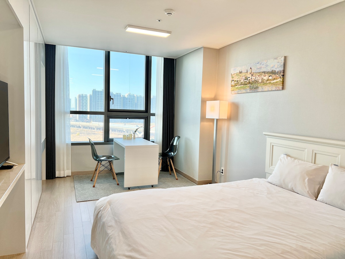 il Porto_ ⚓️⛵️ Bringing back host's experience as a fashion designer in Italy, old port theme's wall deco. & pillows inspired by Incheon's old port 🎨Main colors Ivory/Gray+Wood/Navy Neat, timeless 🕯️Custom Lighting *Gold tone dual LED bar *Luxury hi-rise wall frame / 7m long streamline multicolor LED 🛌 Larger *King bed 📺 4K Chromecast TV 🍿 FREE Netflix 💧FREE water, ‘LG PuriCare’ purifier. Save $ Pets not allowed 😅