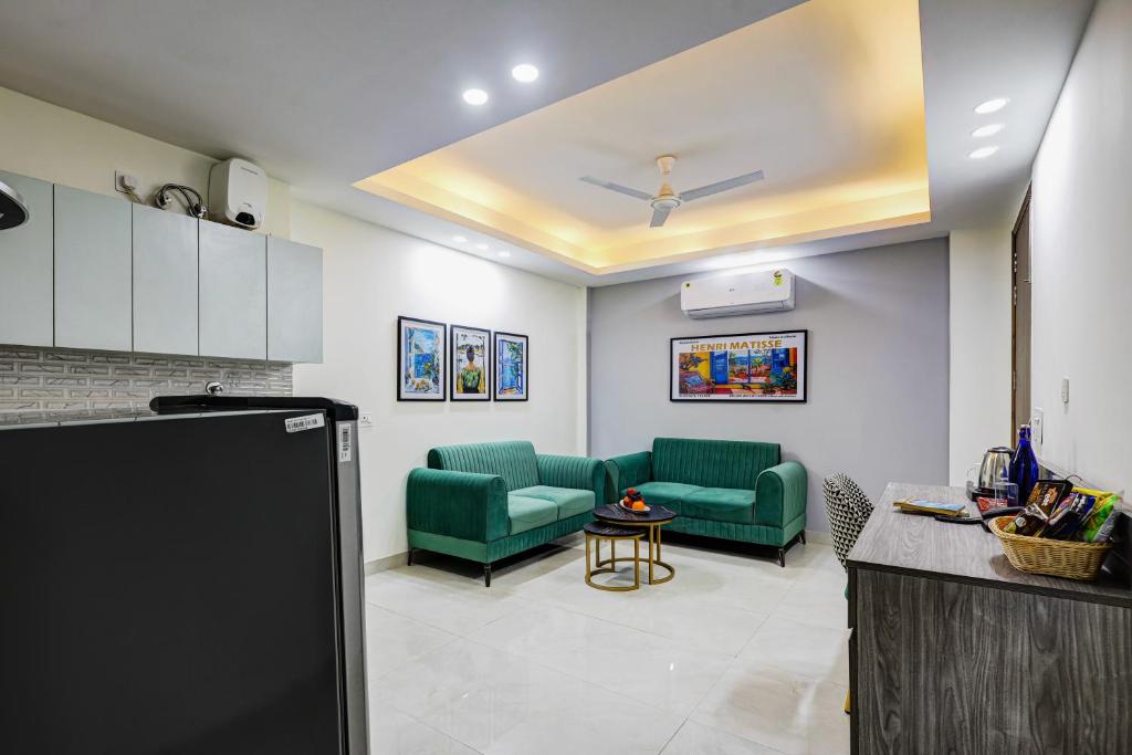 Departamento de servicio premium de 1 habitación y sala de estar en el sector 43, Gurgaon, con aire acondicionado en la sala de estar y el dormitorio, además de una cocina pequeña con inducción, microondas y vajilla. En una zona elegante, a poca distancia del centro comercial Gold Souk y la escuela Shalom Hills, a 2,2 km del metro Millennium City Centre y a 2,1 km del hospital Fortis. Los huéspedes extranjeros son bienvenidos. El check-in anticipado estará sujeto a disponibilidad y tendrá un cargo de 500 rupias, así como el check-out después de la hora establecida, que también tendrá un cargo de 500 rupias por cada 3 horas adicionales.