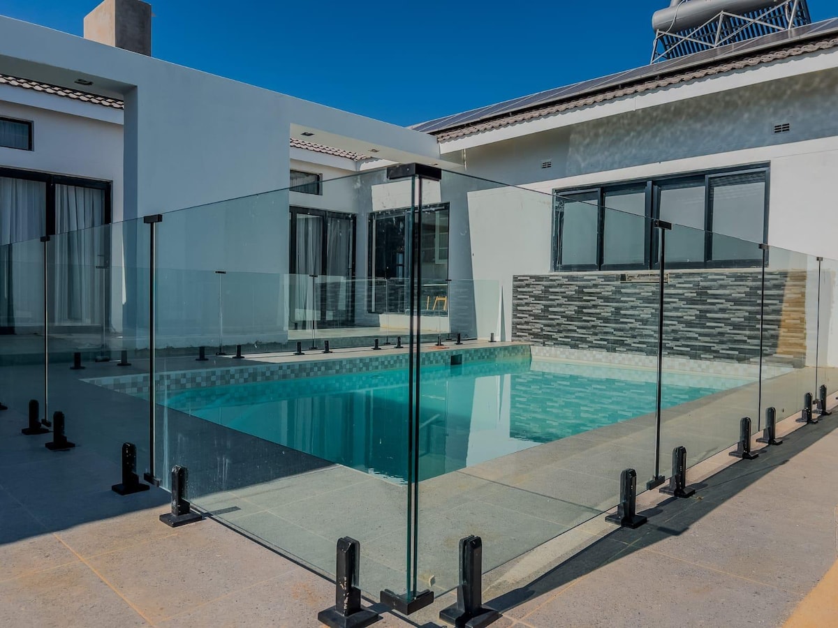 Enjoy a modern, spacious, and peaceful stay away from the noise of the busy city. This self-catering home offers cosy rooms where you can relax, unwind, and enjoy Netflix on demand. ✅ 4 standard double rooms ✅ 1 Family room Ensuite ✅ 2 x common bathroom ✅ 2 x common WC ✅ Common Balcony ✅ Activity room ✅ Kitchen ✅ Family room ✅ Dining room ✅ Double garage Occupancy: Up to 10 guests (additional guests may incur extra charges). Get in touch for special rates if you require fewer than 5 beds.