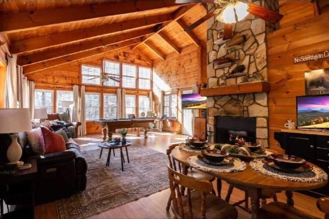 Alpine Mountain Majesty es una cabaña de madera rústica de lujo única con espectaculares vistas a la montaña en 3 acres. 4 dormitorios, 3 baños y medio, cabaña de 3 niveles. El Gran Salón tiene techos abovedados de 25 pies con ventanas del suelo al techo con vistas a las montañas. En la planta baja hay una sala de juegos acabada con mesa de billar, TV, tablero de dardos, juegos y jacuzzi al aire libre con vistas. Esta cabaña está a menos de 10 minutos de la famosa Alpine Helen, Georgia. NO SE ADMITEN MASCOTAS (el propietario es alérgico). Cabaña para NO FUMADORES, SIN EXCEPCIONES. Máximo 6 huéspedes.