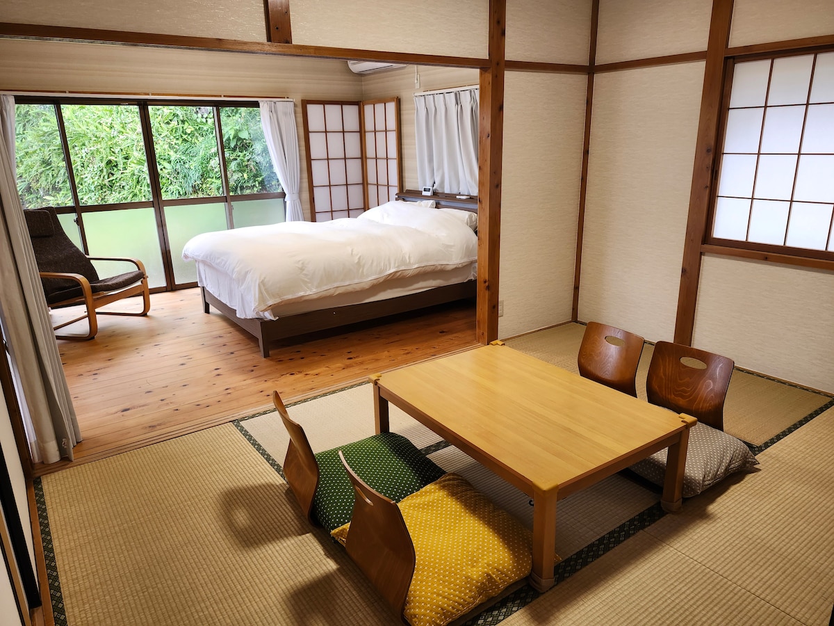 (日本語・English・Français・Español OK)こちらの宿泊先は、飲食店、スーパー、バス停、薬局、コインランドリー等ほぼ徒歩圏内です。底土海水浴場までは徒歩20分ほど。寝室は2つあり、一部屋はダブルベッド(140cm×200cm)、もう一つの部屋は和室でシングル布団を2枚敷くことができます。(施設内禁煙) Non-smoking detached house including two bedrooms: one with a double bed (140cm x 200cm), the other a Japanese-style room that can accommodate two single futons.Centrally located, within walking distance of restaurants, supermarkets, bus stops, pharmacy, and coin laundry. The popular Sokodo Beach is about a 20-minute walk away.
