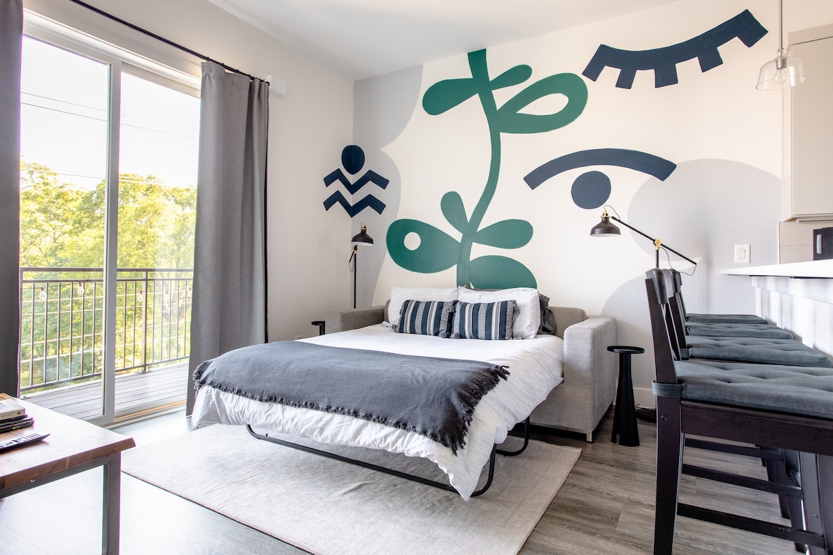 Ask about free late check out! Enjoy a local beer on our top-floor patio overlooking the famous skyline of downtown Nashville. The centerpiece of this urban oasis with lofted ceilings is a one-of-a-kind art installation painted by local Nashville artist Jess Foley. Unwind and get comfortable in this hip, spacious condo. The Article sleeper sofa is equipped with a super comfortable queen-size memory foam mattress. Conveniently located and within walking distance to several local spots.
