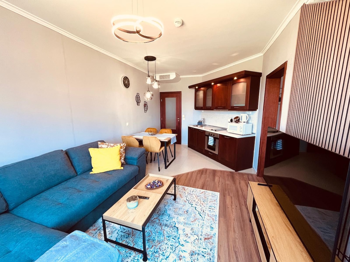 Newly renovated Spacious Studio. Just 5 minutes from the Ski Gondola in a complex Pirin Sense with great SPA, a Lobby bar for Breakfast, an Outside BBQ, and a Ski shuttle. Amazing atmosphere, quiet, and beautiful surroundings. Perfect place to have a peaceful and relaxing vacation. You can enjoy a memorable sunrise in the morning and have a warm movie night
