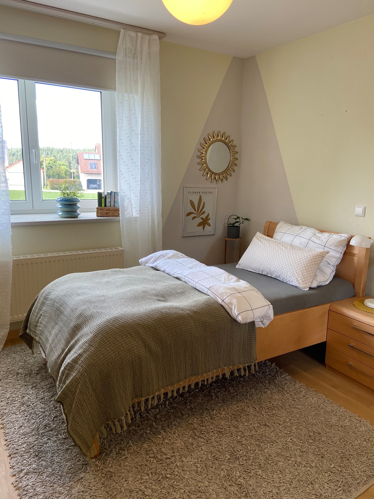 Apartamento amueblado con estilo en una casa adosada (nueva construcción) con el siguiente equipamiento: - Cama de 140 x 200 cm - baño privado - persiana eléctrica - Cafetera (incluye café) - Microondas combinado con convección - Nevera - Televisor - Wifi - Secador de pelo para invitados - Calefacción por suelo radiante - Control de ventilación central - Puerta insonorizada independiente con timbre/abrepuertas - Cómoda - Mesa de comedor - Vajilla - Aparcamiento gratuito - Posibilidad de carga de vehículos eléctricos - Equipamiento inicial incl. (ropa de cama, toallas)