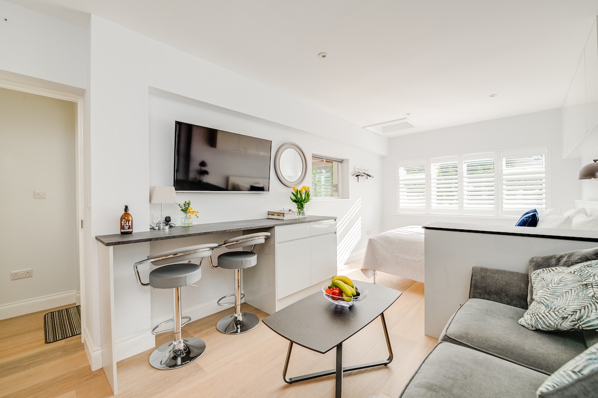 Anexo recientemente reformado con aparcamiento fuera de la calle y entrada privada para dos huéspedes. El anexo tiene una cama tamaño king, una sala de estar con TV inteligente HD de 49 pulgadas, un baño con ducha/WC separado y una cocina americana bien equipada por si quieres cocinar.